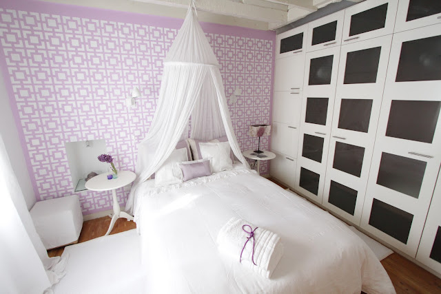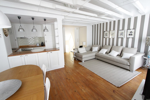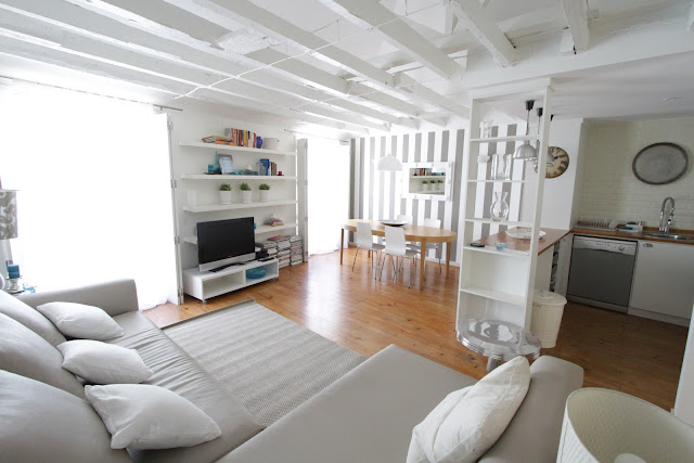 Este adorável e pequeno apartamento era onde vivía com a minha família, antes de mudarmos para uma casa maior. Continua nossa porque foi onde o meu filho teve o seu primeiro quartinho e ele adora esta casa. Costuma dizer que é a sua 'casa pequenina' e adora lá ir ver as riscas do quarto de quando era bebé. Decidimos não vendê-la e como está bem localizada no Chiado, é alugada a turistas no sistema de aluguer de curta duração. Foi a melhor decisão que tomámos porque está ocupada, quase o ano todo. De vez em quando faço pequenos re-sytlings para a tornar mais actual e confortável. Estas fotos foram tiradas há cerca de dois meses e por mais que mude as cores do quarto ou o papel de parede da sala não consigo mudar as riscas do quarto do meu filho... Acho que ele nunca mais me perdoaria!