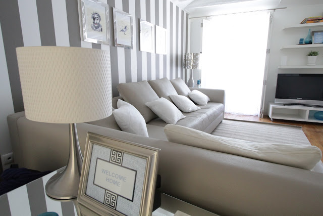 Adorei o papel de parede da sala, o das riscas cinza, e tenho andado à procura de algo idêntico para usar na minha casa.
