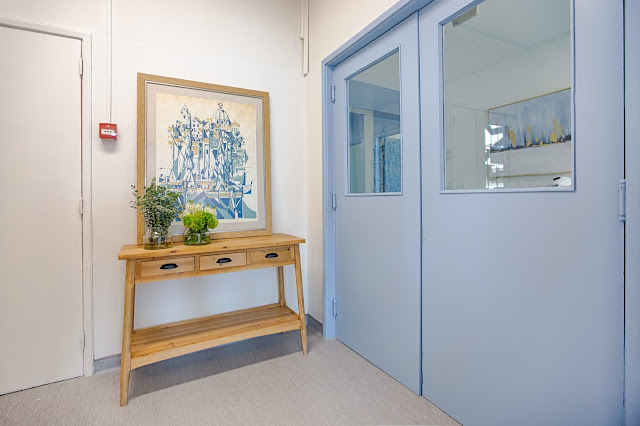 Para mim parece que foi ontem o meu último post no blogue e até os dias que passei nestes corredores mas bom!... Na verdade foi há 4 meses e se vos contasse tudo o que aconteceu na minha vida nos últimos quatro meses estava aqui mais quatro horas! Vamos abreviar e passar ao post para vermos uma luz ao fundo do tunel como neste corredor do IPO, onde passámos tantas horas no primeiro programa da série do Querido Mudei a Casa. Posso dizer-vos que a maior parte destas faixas azuis que subiam as portas ao tecto e acompanhavam a cor no pavimento, foram feitas pelos Queridos decoradores do programa onde todos andaram de pincel na mão! Eu própria fiquei sem costas de andar empoleirada num escadote a pintar azul no teto e na parede. Este era o corredor que unia todos os quartos desta unidade e eu quería que fosse simples clean e apenas com algo que o destacasse e nos ficasse na memória como este efeito de caixa no corredor.