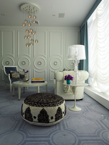 | Love the classic paneling on the walls and the unexpected appearance of a Moroccan puffe! *** Adoro os paineis clássicos das paredes misturados com o inesperado aparecimento de um puffe marroquino. |