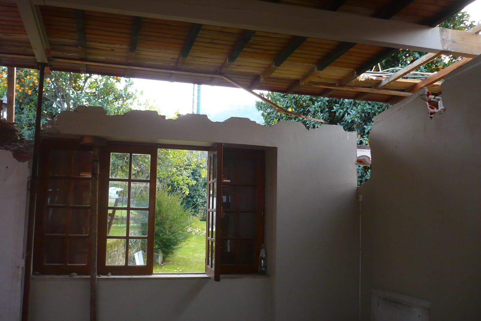 I so wanted to keep the ceiling slatted wooden structure that they raised all 400 square feet of roof with hydraulic jacks and turnbuckles to be able to add about 1 meter to the right foot. Very impressive.