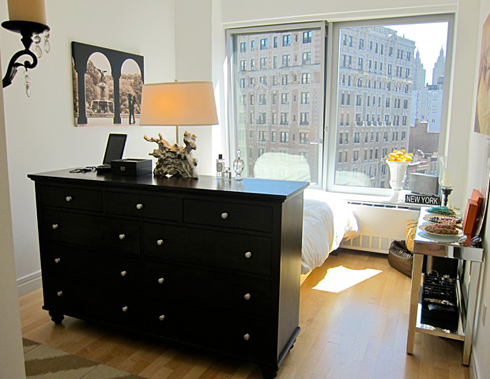 neste caso a cómoda também serviu como cabeceira de cama e dividiu a zona de closet da zona de dormir.