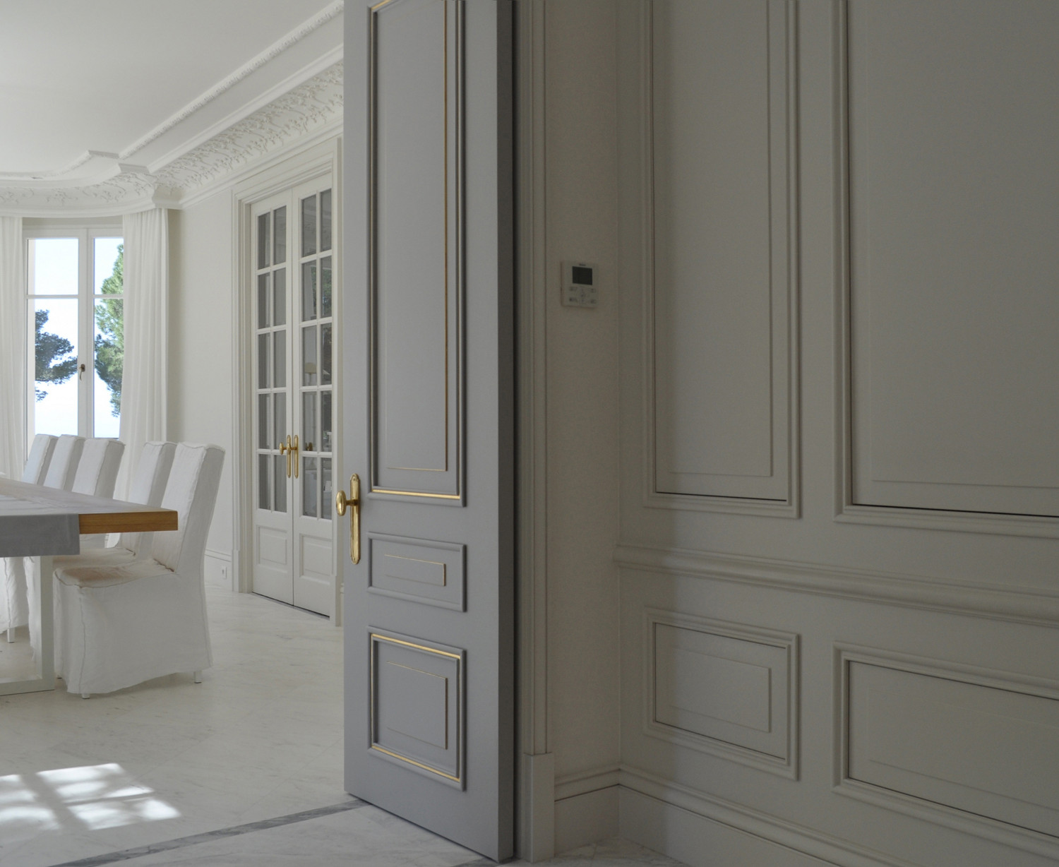 Estou num momento 'WOW', com os candeeiros, os frisos e os puxadores dourados que pontuam o cinza das portas e das paredes. Esta casa é absolutamente magnífica não acham?!