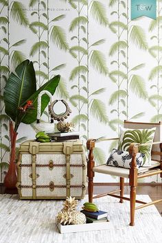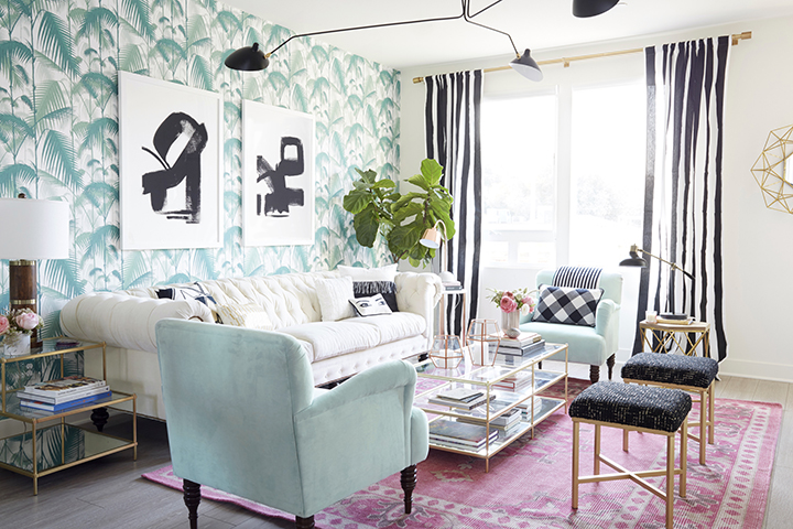 Such a happy looking-living room this one! The wallpaper makes it so special and I love the ecletic mix of palm trees, black and white stripes and the pink rug all with the brass gold details.