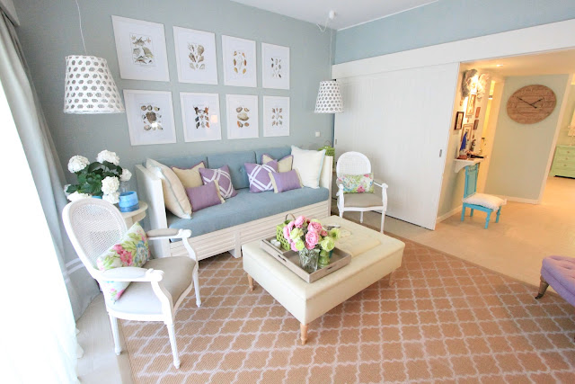 Tinha de ser eu a fazer este projecto e tinha de ser eu a mudar a vida da Maria Cândida. Parece coisa do destino. Não sou fanática destas coisas mas acredito que o universo dos dá oportunidades de compensarmos, perdoarmos, vivermos, ou darmos de volta tudo o que temos. O prédio chamava-se Riviera e esse foi o meu mote para este projecto. Riviera - palavra associada a zona costeira mas requintada e 'endinheirada', tratada e cuidada. Rústico leve e arejado. Influenciado pela proximidade com o mar e a Costa do Sol. Inspiração do mar e praia mas de forma contida e não em demasia. Mistura dos tons azuis, verdes e motivos florais. Tecidos leves e naturais, linhos e alinhados, sisal e texturas visuais e tácteis. Abuso do uso das palhinhas naturais. Não demasiado clássica pois esta é uma sra. moderna e enérgica mas confortável e envolvente. Manter objectos antigos e com história mas pintados e reciclados. Forte componente religiosa que estava presente por toda a casa e tinha de ser mantida mas de uma forma mais estética.