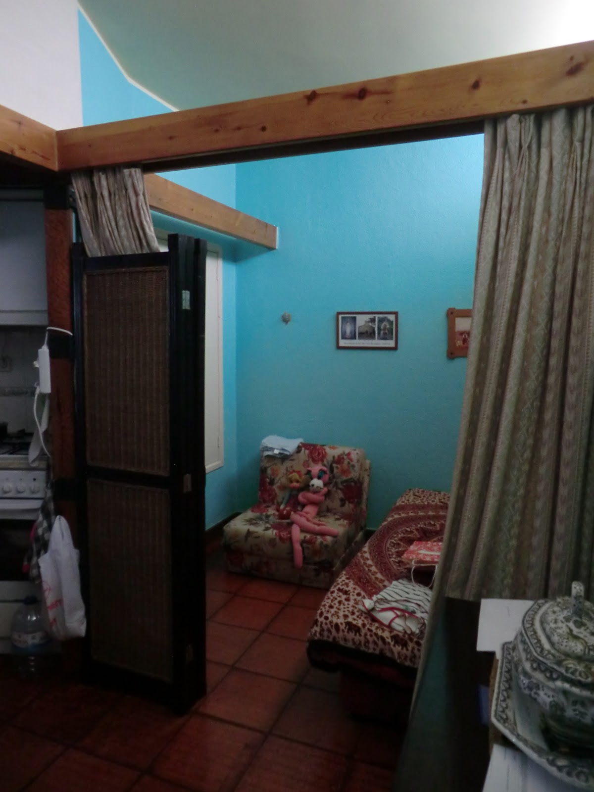 Keep objects and ancient history but painted and recycled. Strong religious references were all over the house and had to be maintained but in a better and rather stylish way. The house had a few problems; she did not have a bedroom and slept in the living room so she did not have a living room either; the refrigerator was too far from the kitchen area; the house was too dark; too much big and heavy furniture; lack of storage and the tiniest shower cabin ever for a 70 year old lady. Very important to create a special bedroom place apart from living room. All this in a 40m2 studio.